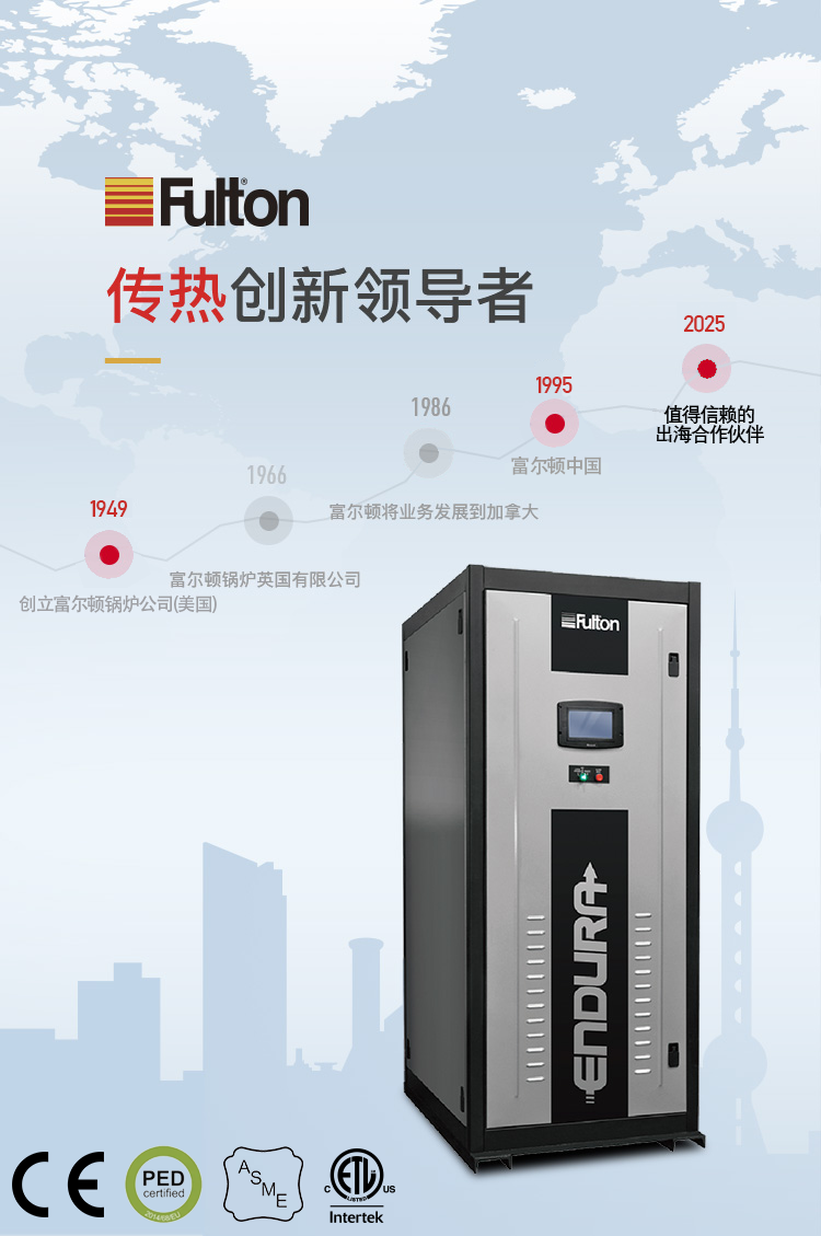 富爾頓是國際著名的跨國高質(zhì)量傳熱產(chǎn)品制造商,具有七十多年的專業(yè)設(shè)計、制造、銷售鍋爐的經(jīng)驗,是立式無管鍋爐和脈沖燃燒鍋爐的發(fā)明者,幾十年來一直領(lǐng)導(dǎo)世界鍋爐新潮流。